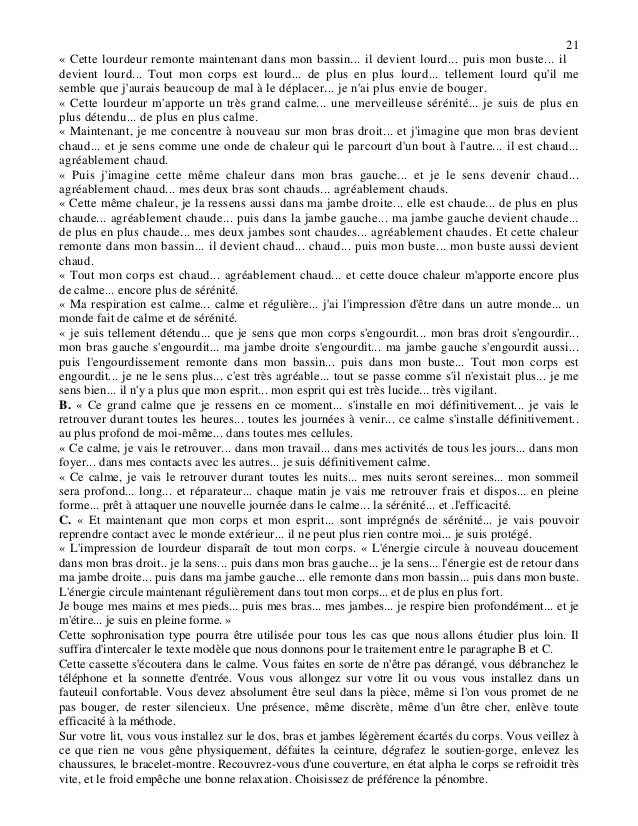 Exercices de sophrologie textes. L'utilisateur aura suivi les menus proposés, les exercices de sport suggérés et les séances de sophrologie du programme au moins 3 jours par semaine (suivi qui devra être documenté dans le carnet alimentaire de l’utilisateur) Le soutien personnalisé et l’échange avec notre diététicienne sont la clef de votre réussite. La sophrologie créée en 1960 par le neuropsychiatre Alfonso Caycedo, est définie par son créateur comme une « nouvelle école scientifique qui étudie les modifications de la conscience humaine 1 »Les sources d'inspiration de la sophrologie sont multiples l'hypnose, la phénoménologie, la relaxation progressive d'Edmund Jacobson, le training autogène de Schultz, ainsi que le yoga. Le Nei Jing Su Wen, attribué à l'empereur Jaune, est le plus grand des textes chinois classiques de l'acupuncture.