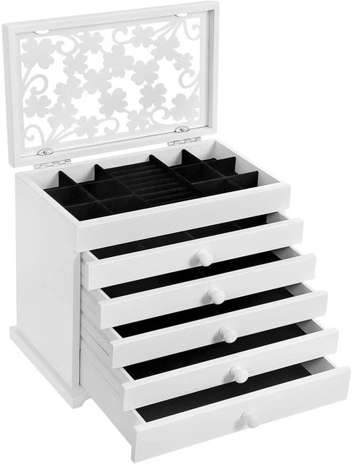 Songmics Boite A Bijoux A 3 Niveaux Rangement A Bijoux En Bois D Ingenierie Coffret A Bijoux Original Avec Tiroirs Pour Bagues Boucles D Oreilles Bracelets Colliers Blanc Jow15wn