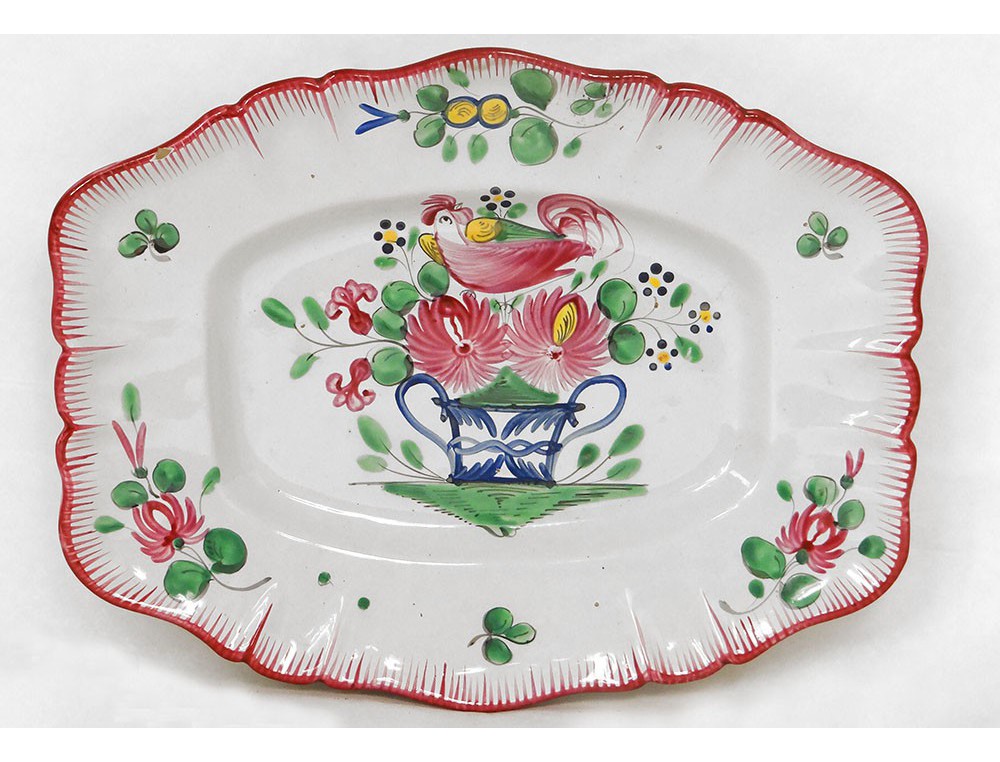 Plat Faience Fleurs Coq Polychrome Saint Clement Antique French Xixeme